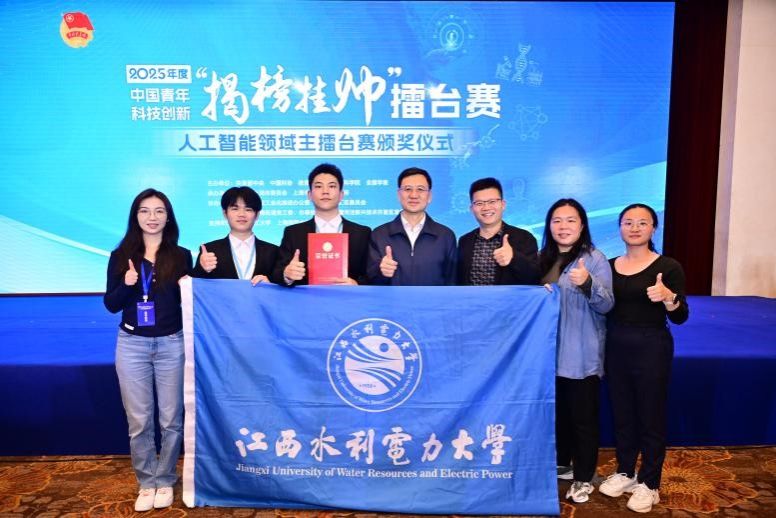 2025年度“挑战杯”中国青年科技创新“揭榜挂帅”擂台赛人工智能领域终审擂台赛于10月18日至20日在上海市成功举办。我校刘祖文、李欣怡、田帅老师指导、2024级水利工程专业研究生闵志武负责的项目《城市洪涝迷宫·AI最优解》荣获一等奖。颁奖现场,团中央青年发展部一级巡视员郭美荐对团队表示肯定鼓励并合影留念。