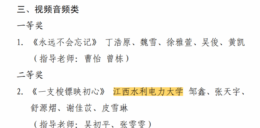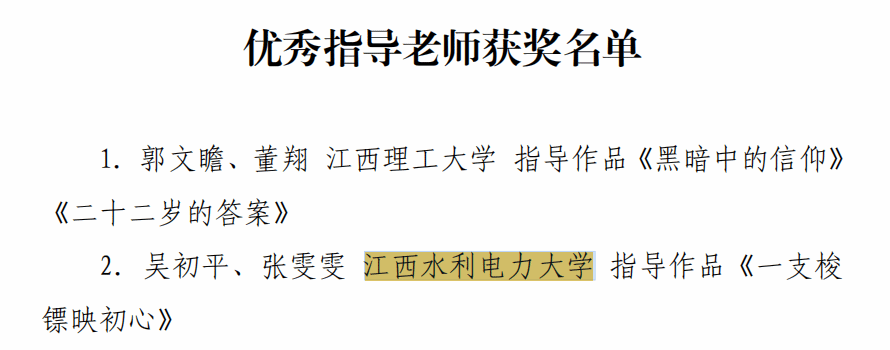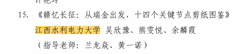 其中,由吴初平、张雯雯老师指导,邹鑫等同学创作的视频音频作品《一支梭镖映初心》荣获二等奖;由兰龙焱、黄一诺老师指导,吴欣豫等同学创作的《赣忆长征:从瑞金出发,十四个关键节点剪纸图鉴》获得文创产品类优秀奖。吴初平、张雯雯两位老师荣获“优秀指导老师奖”,我校亦被授予“优秀组织奖”。
