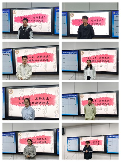 比赛采用“现场抽题、即时构思、限时演讲”的方式,题目内容涵盖专业认知、学科竞赛、校园生活、青春理想、社会热点等多个方面。面对随机抽取的演讲主题,参赛选手沉着应对,在有限时间内迅速理清思路、搭建演讲框架,并以清晰的逻辑、真挚的情感和生动的语言完成即兴表达,充分展现了良好的心理素质与语言组织能力。