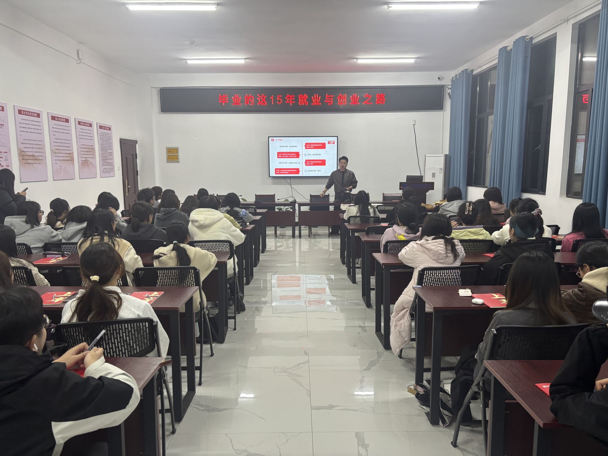 3月25日晚,为提升学生创业与就业能力,我院团委在济民楼A412就业宣讲室举办优秀校友成长分享会。本次活动邀请到了江西华公未来教育科技有限公司副总经理、我院2012届市场营销专业校友刘天昊入校分享,全院各年级各专业50余名学生参加。
